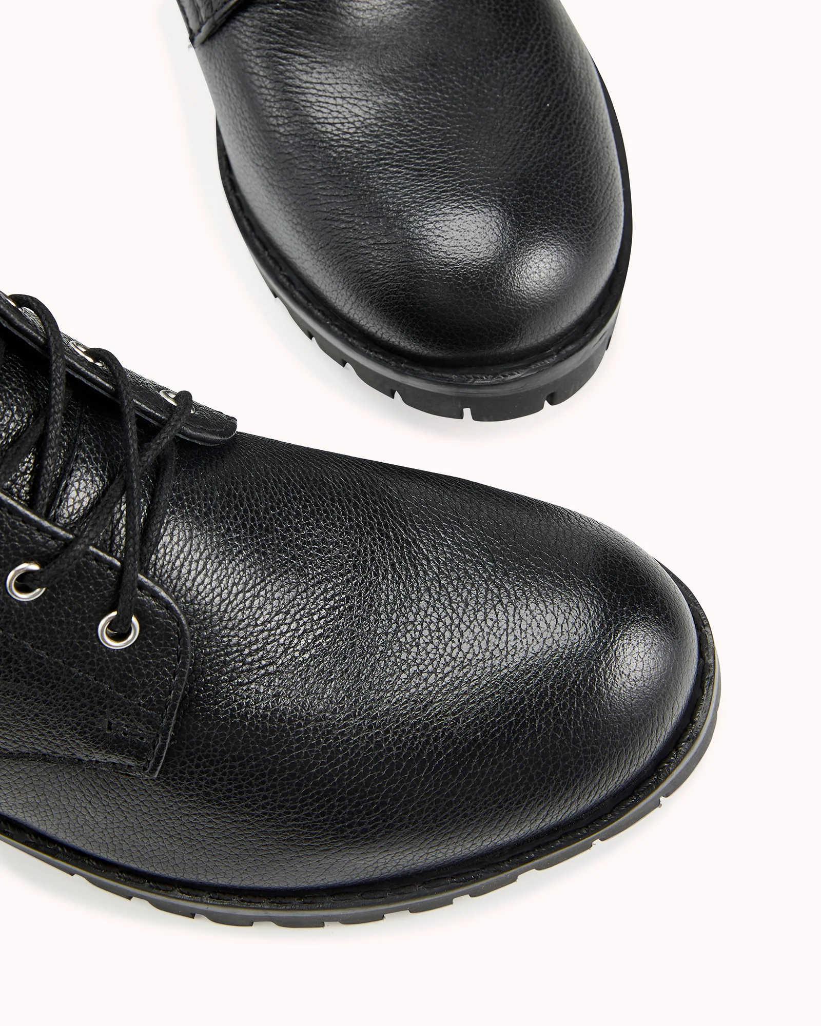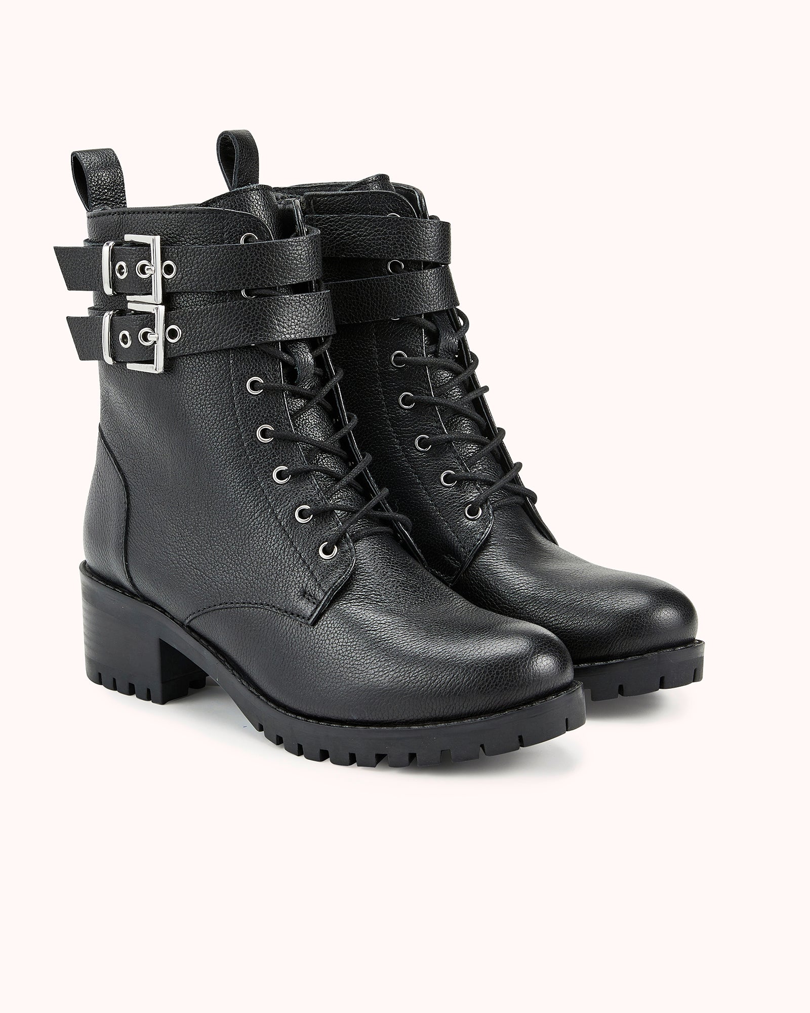 Notre modèle DAVINA est une boots à lacets à petit talon de 5 cm et semelle crantée. Sa tige en cuir grainé noir est habillée de jolies boucles argentées sur la cheville. Ce modèle à l’esprit ranger, idéal pour l’hiver, saura sublimer tous vos looks.