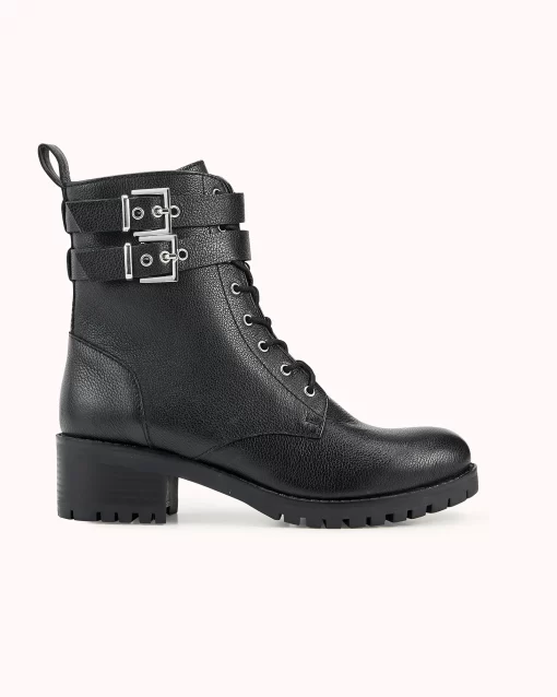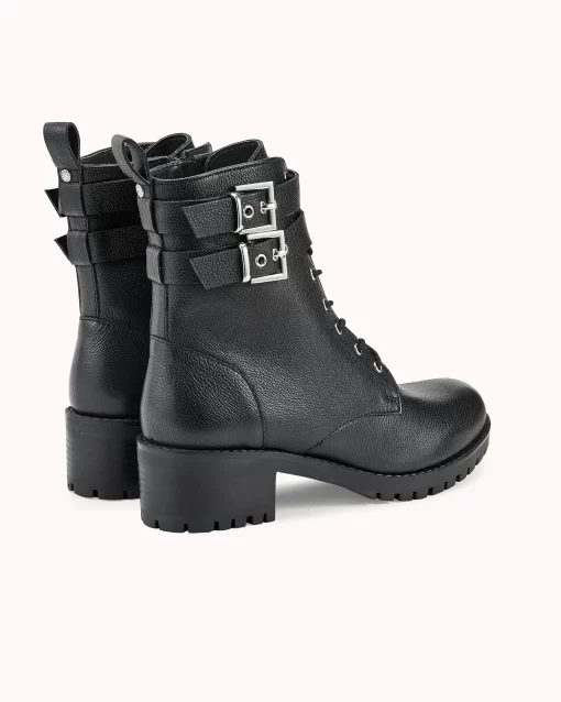 Notre modèle DAVINA est une boots à lacets à petit talon de 5 cm et semelle crantée. Sa tige en cuir grainé noir est habillée de jolies boucles argentées sur la cheville. Ce modèle à l’esprit ranger, idéal pour l’hiver, saura sublimer tous vos looks.