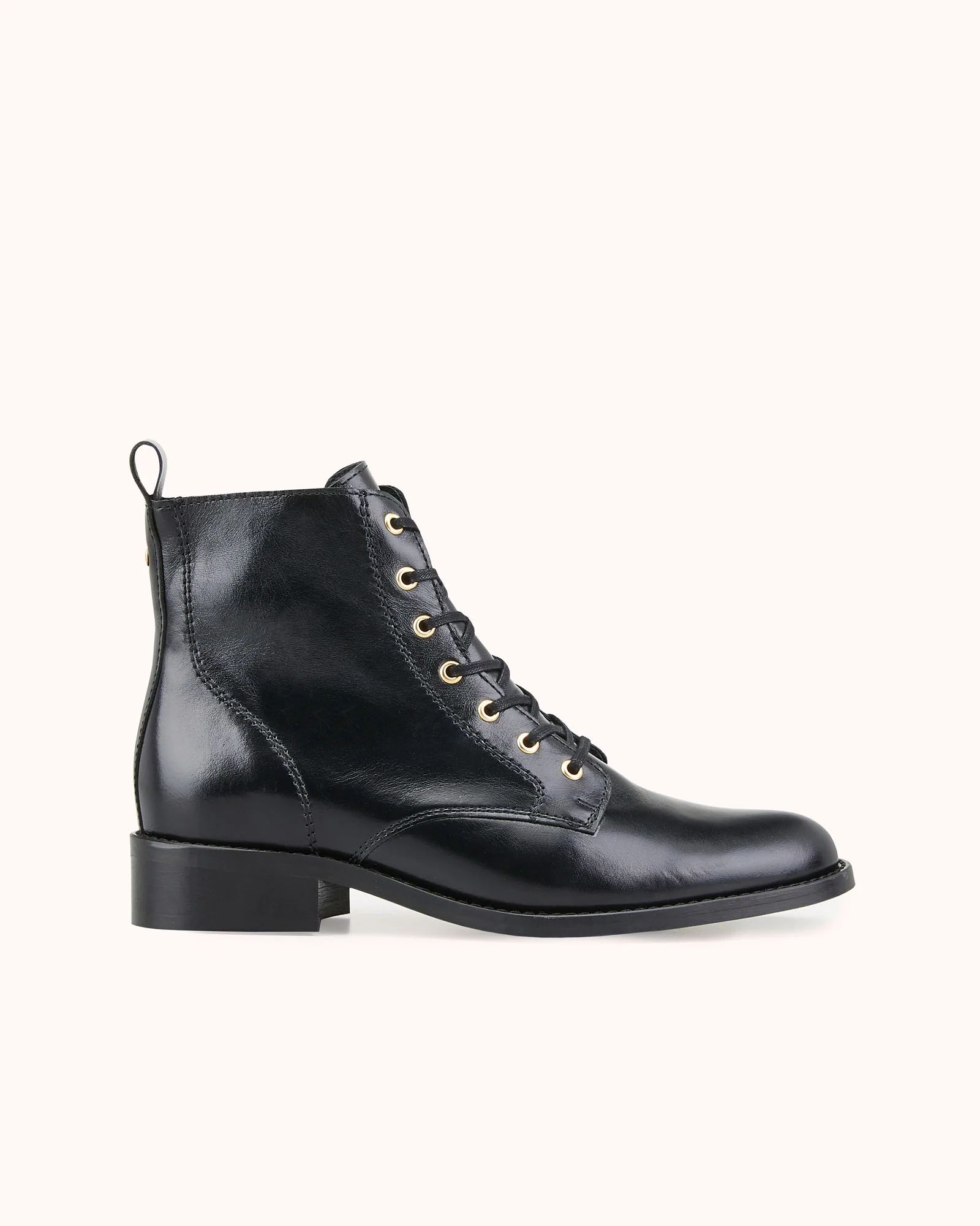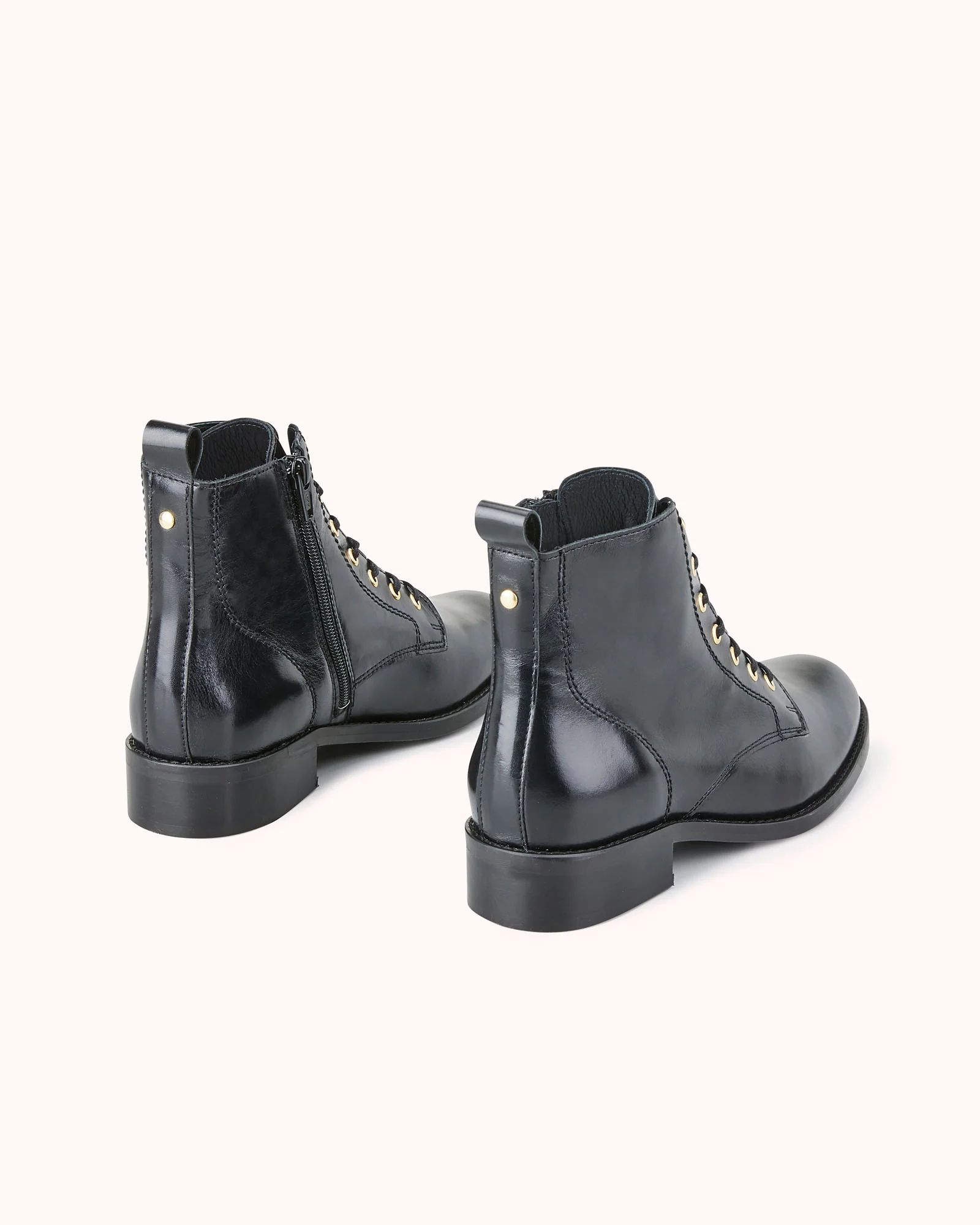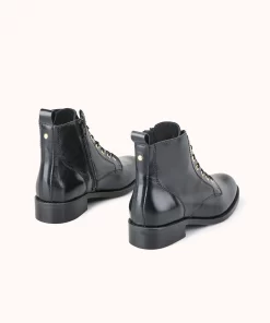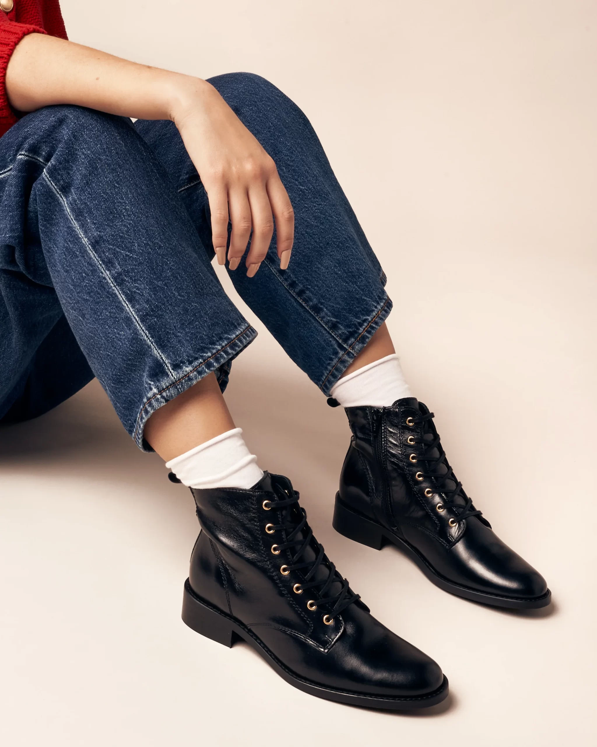 La FIBI est une bottine plate déclinée en cuir lisse noir ou marron légérement brillant et en cuir pony léopard. Ses oeillets dorés lui apportent la touche tendance et féminine. La FIBI sera votre meilleur atout des looks quotidiens. Si vous hésitez entre deux pointures nous vous recommandons de prendre la pointure au-dessus.