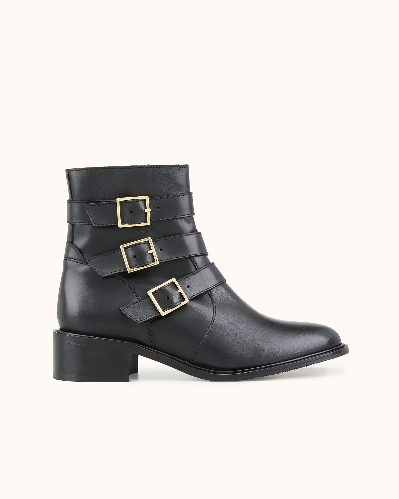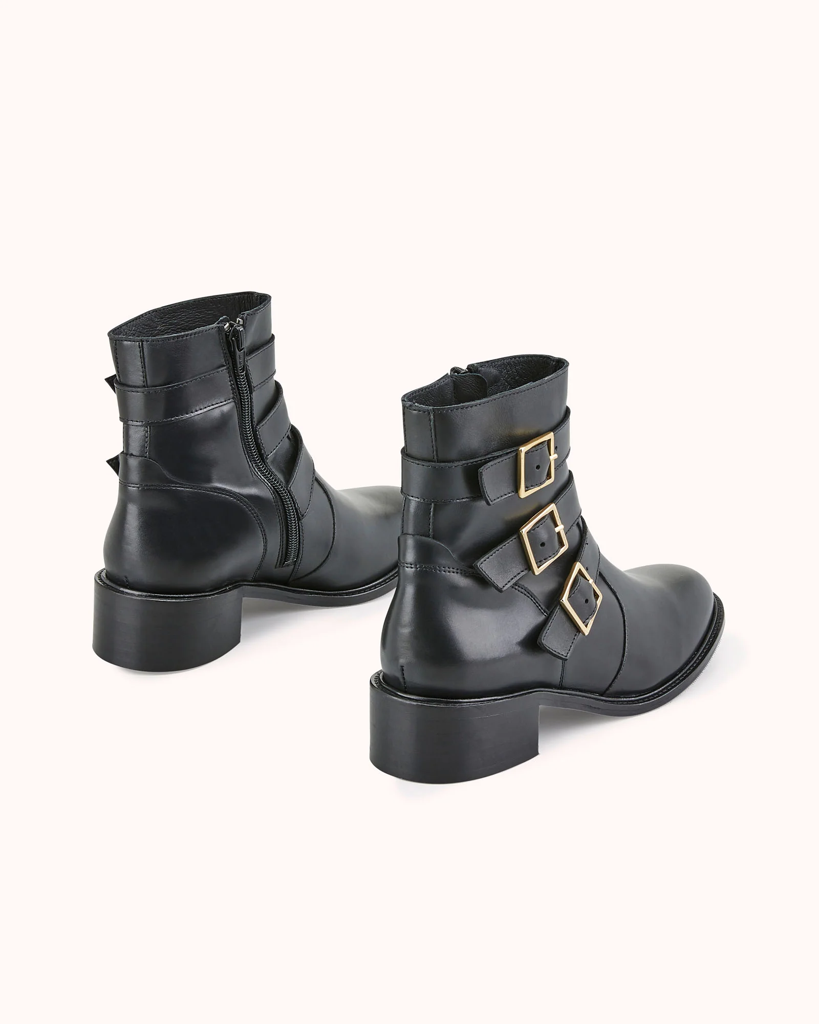 La VILNA est une bottine à petit talon de 3 cm. Elle est habillée de 3 brides avec des jolies boucles carrées dorées. Disponible en cuir lisse noir ou en cuir veau velours cognac, son allure féminine et rock font de ce modèle la paire à la shopper cette saison. Ce modèle est fabriqué avec du cuir issu de tanneries certifiées Leather Working Group au niveau « gold ».