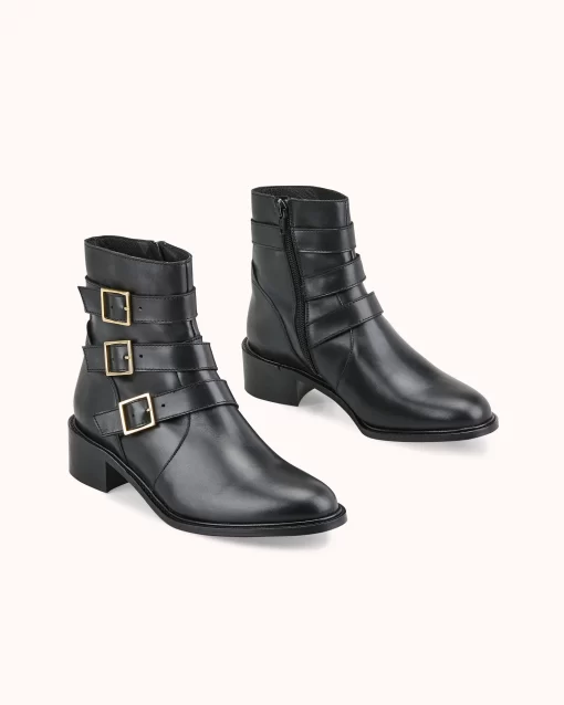 La VILNA est une bottine à petit talon de 3 cm. Elle est habillée de 3 brides avec des jolies boucles carrées dorées. Disponible en cuir lisse noir ou en cuir veau velours cognac, son allure féminine et rock font de ce modèle la paire à la shopper cette saison. Ce modèle est fabriqué avec du cuir issu de tanneries certifiées Leather Working Group au niveau « gold ».