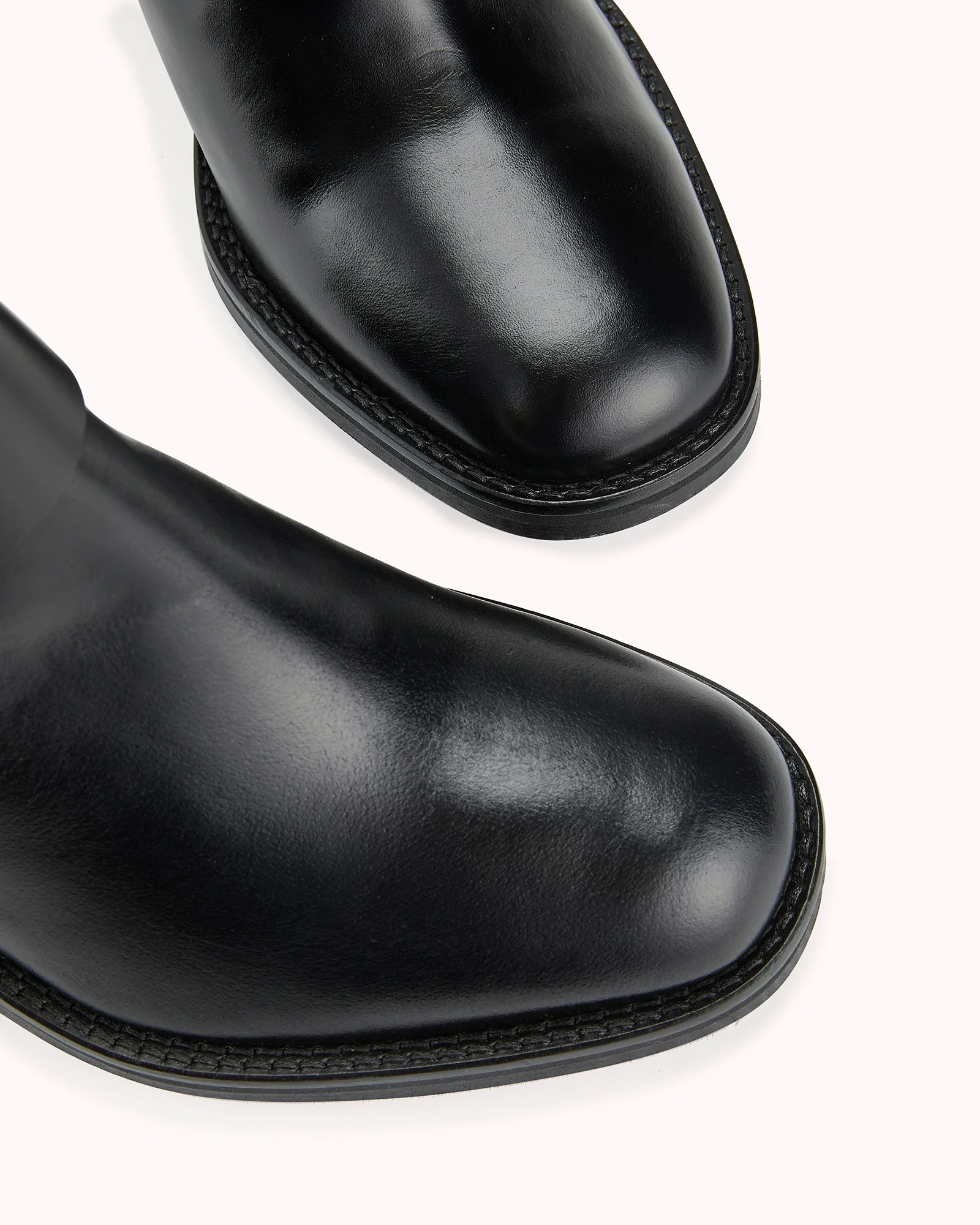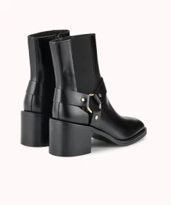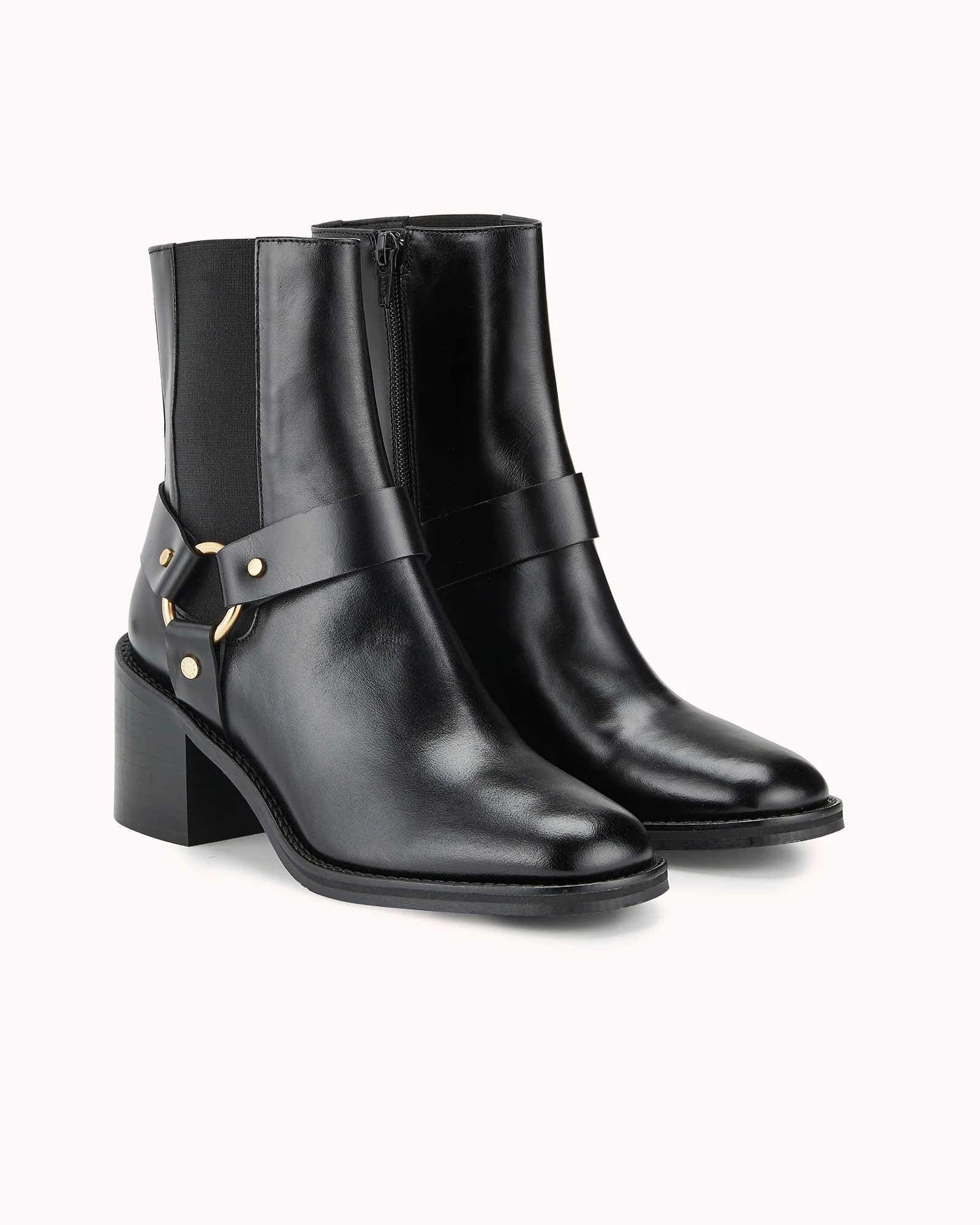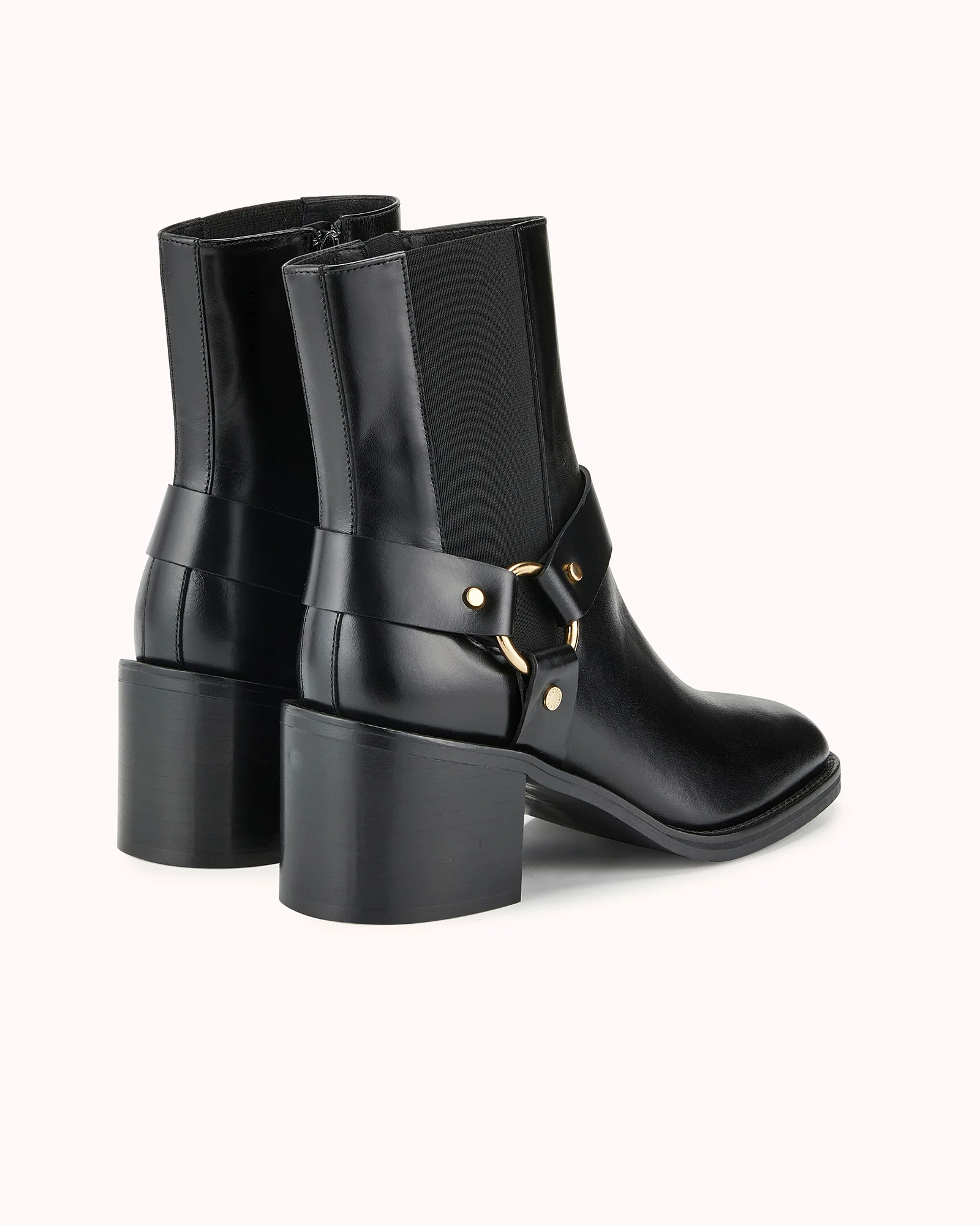 Notre modèle PHOEBE est une bottine en cuir noir avec un esprit motarde chic. D’autre part, ses détails de métalleries dorées lui confèrent un look rock et féminin. Elle est la paire parfaite pour sublimer vos tenues.