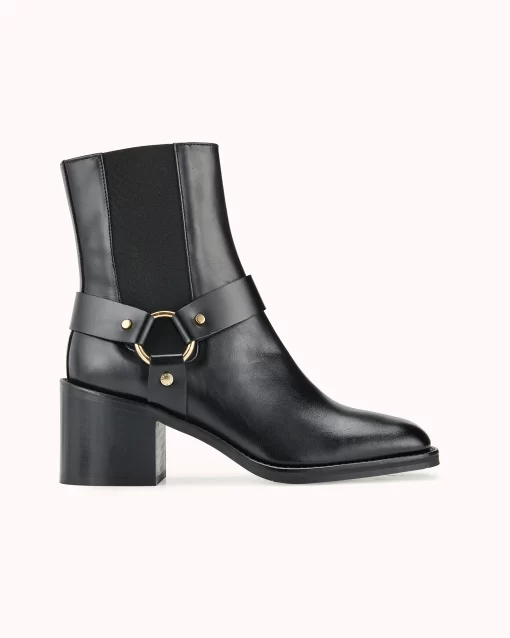 Notre modèle PHOEBE est une bottine en cuir noir avec un esprit motarde chic. D’autre part, ses détails de métalleries dorées lui confèrent un look rock et féminin. Elle est la paire parfaite pour sublimer vos tenues.