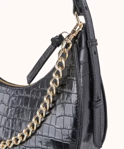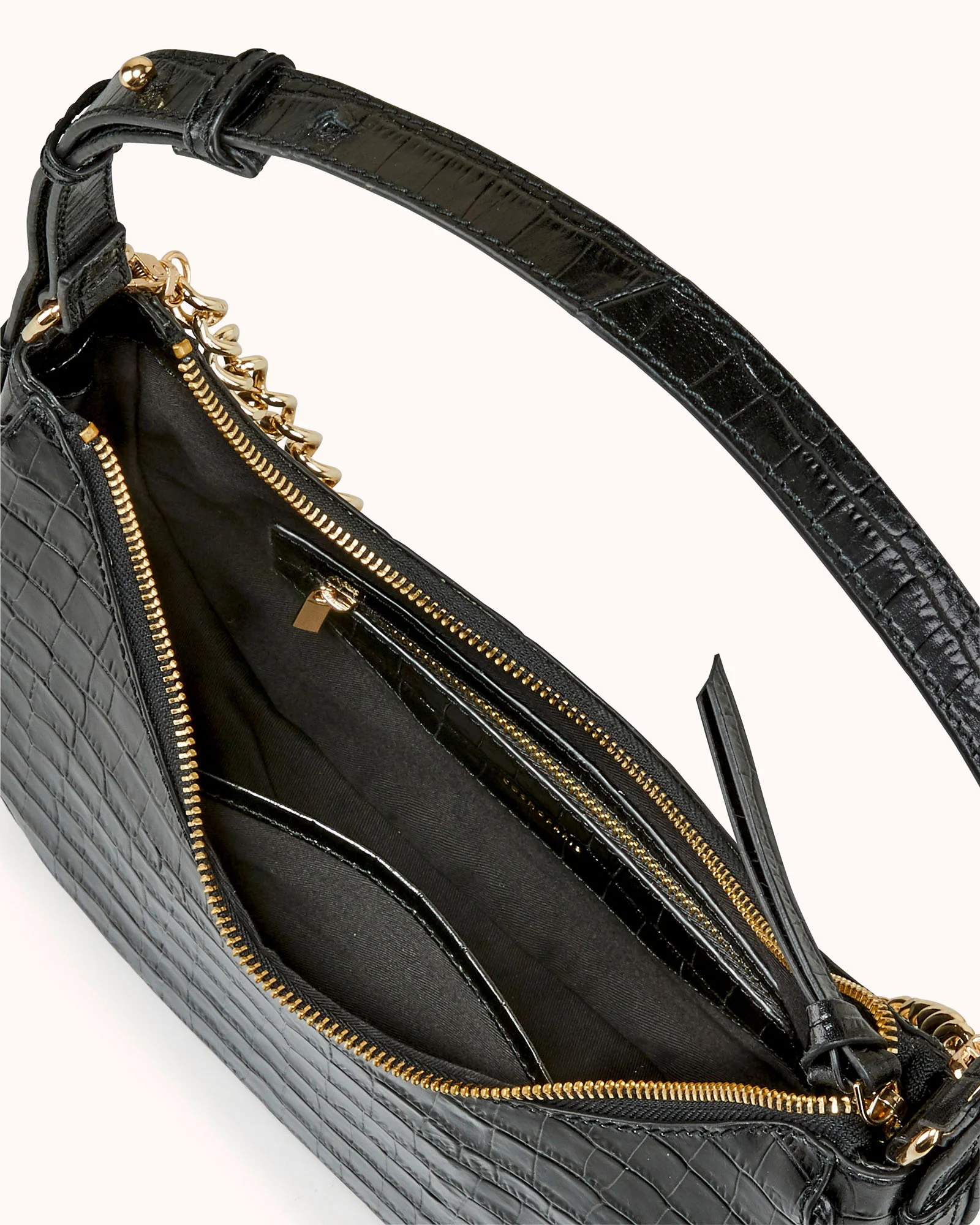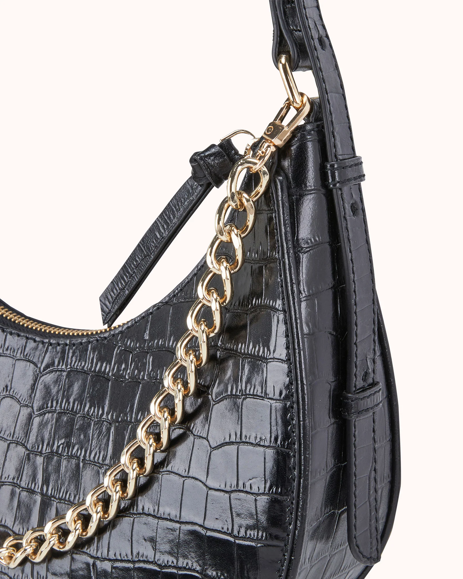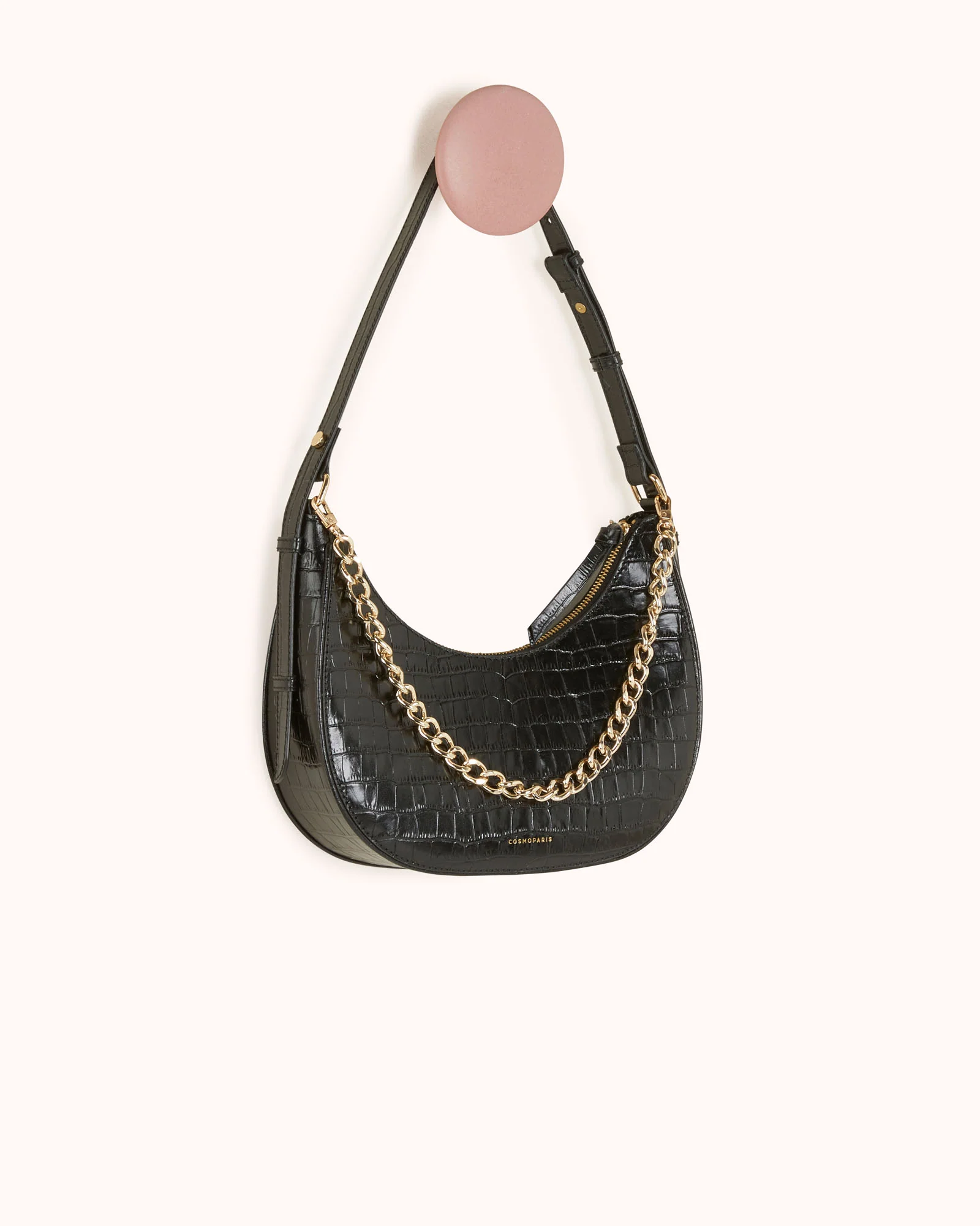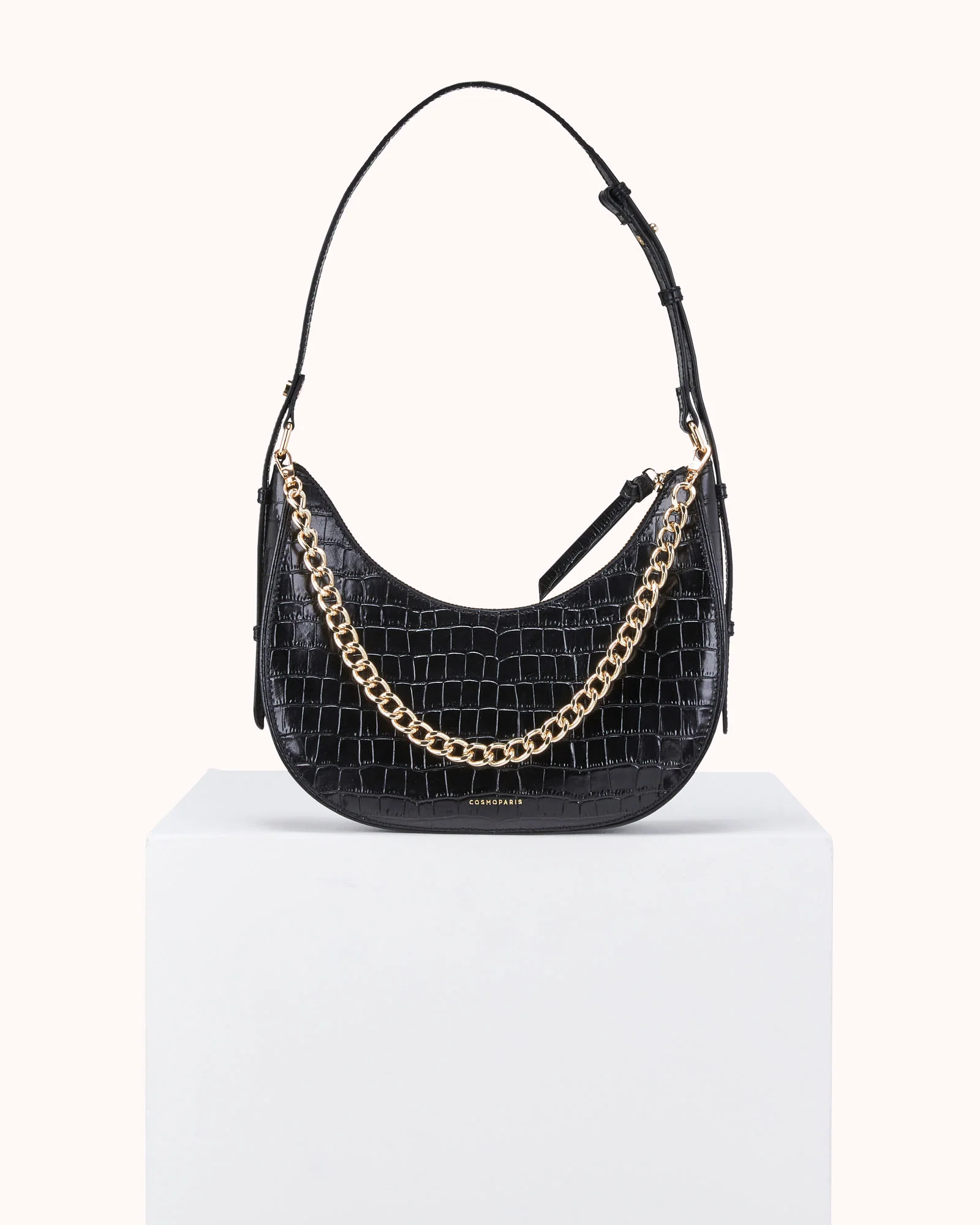 Après le succès de notre sac AURIANE, craquez pour notre sac AURA! Cette saison, il s’accompagne d’une chaîne décorative amovible. Il est disponible en deux versions: en cuir effet embossé croco noir pour un peaufiner un look quotidien chic et en cuir métallisé étain pour un look rock et féminin. À porter court sous l’épaule ou plus long en cross body grâce à son anse réglable, il saura vous conquérir! Dimensions : H19 cm x L26 cm x P8 cm