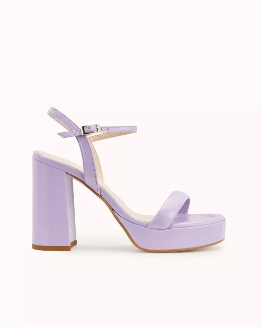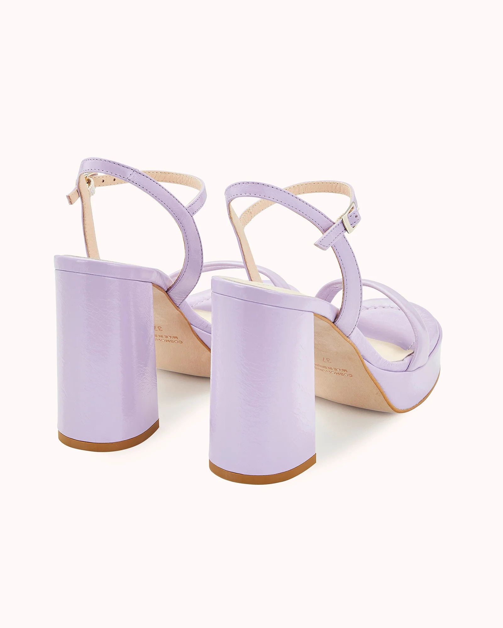 Notre modèle NAOMIE est une sandale talon à plateforme. Sa forme arrondie, sa robe en cuir vernis craquelé lilas et son talon résolument mode de 10 cm en font une paire incontournable pour cette saison.