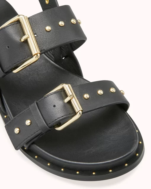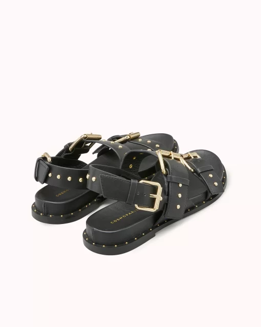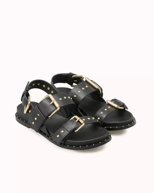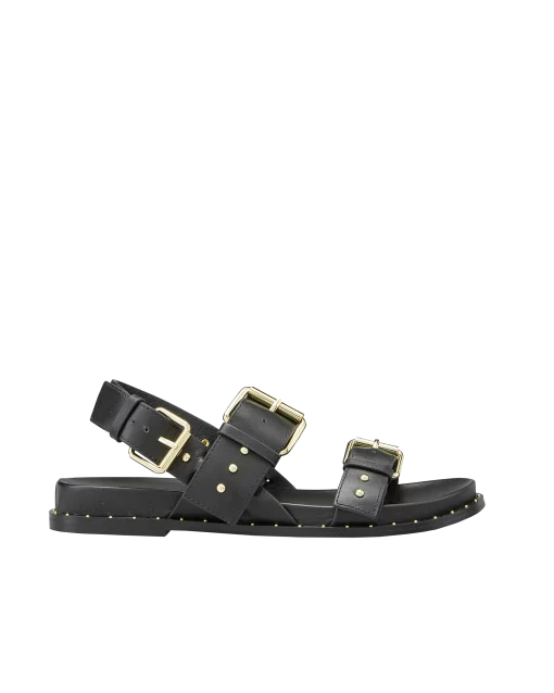 HASSI est une sandale plate au look néo-rock et très urbain grâce à sa tige multi boucle ornée de clous dorés. En cuir lisse noir, ce modèle très tendance saura s’adapter à toutes vos tenues. Ce modèle est fabriqué avec du cuir issu de tanneries certifiées Leather Working Group au niveau «gold»
