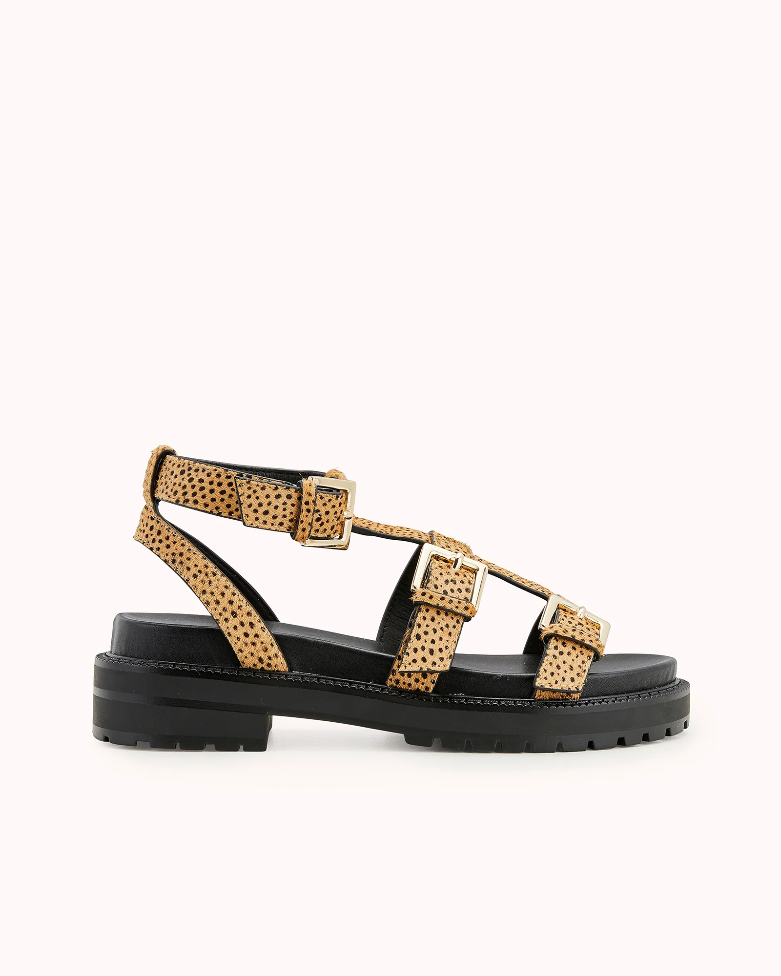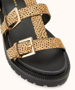 Notre sandale HIJOUX est un modèle phare de la saison. Sa semelle crantée ultra tendance et ses boucles dorées ne vous feront pas passez inaperçue. Craquez pour sa nouvelle version en cuir pony léopard: imprimé phare de notre collection! Ce modèle est fabriqué avec du cuir issu de tanneries certifiées Leather Working Group au niveau «gold»