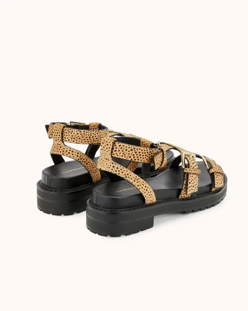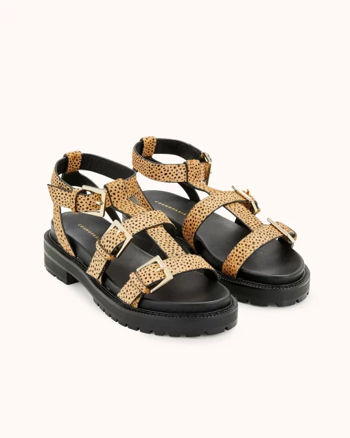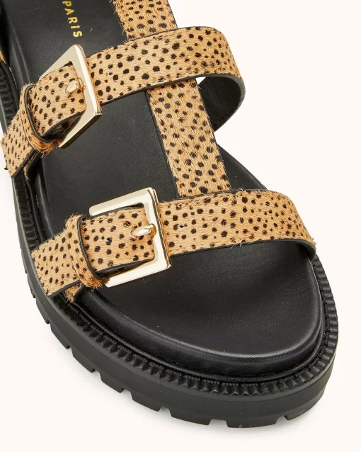 Notre sandale HIJOUX est un modèle phare de la saison. Sa semelle crantée ultra tendance et ses boucles dorées ne vous feront pas passez inaperçue. Craquez pour sa nouvelle version en cuir pony léopard: imprimé phare de notre collection! Ce modèle est fabriqué avec du cuir issu de tanneries certifiées Leather Working Group au niveau «gold»