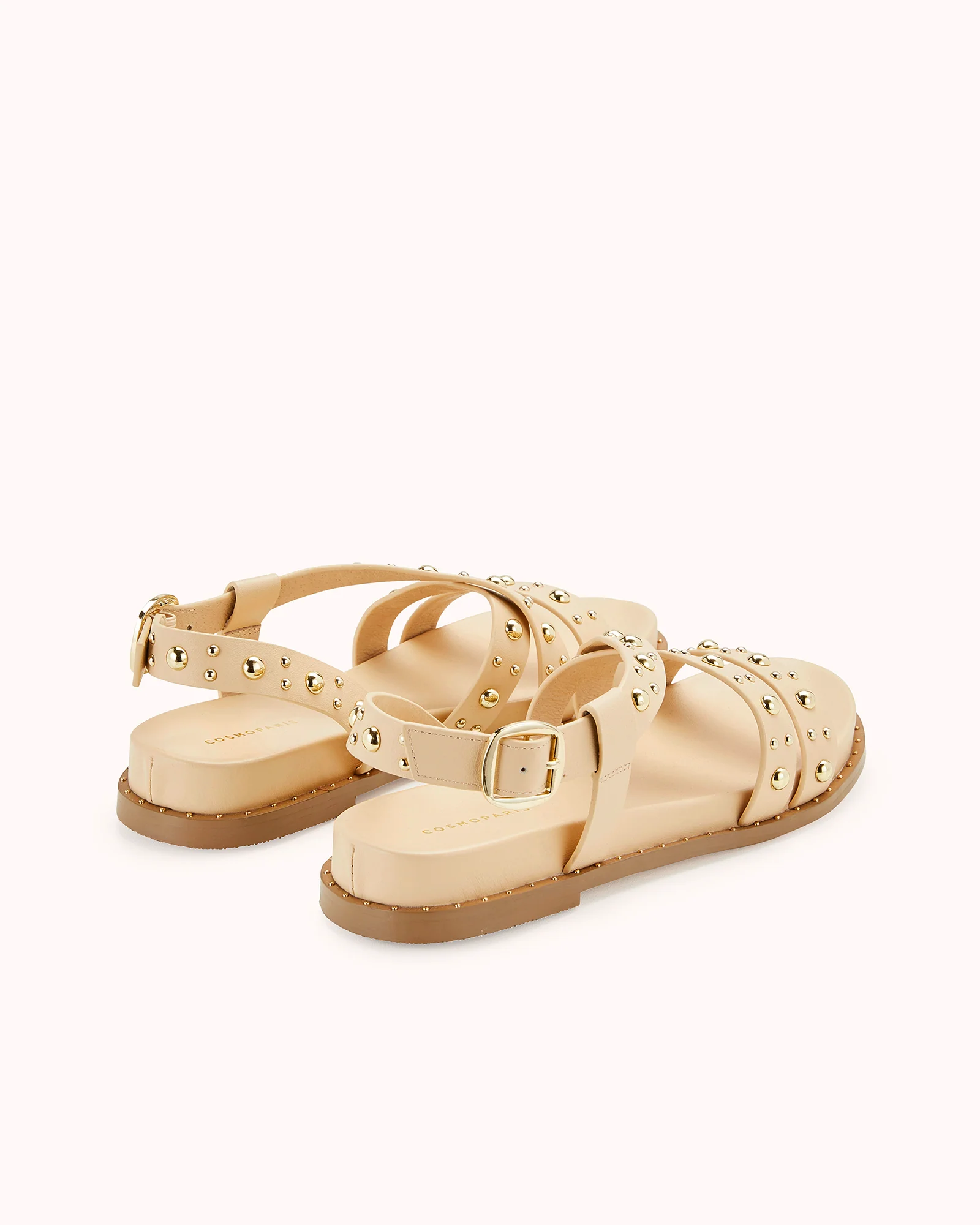 Notre modèle HOLINE, sandale rock et féminine ornée de clous dorés, avec sa tige asymétrique, saura sublimer vos looks au quotidien. Ce modèle est fabriqué avec du cuir issu de tanneries certifiées Leather Working Group au niveau «gold».